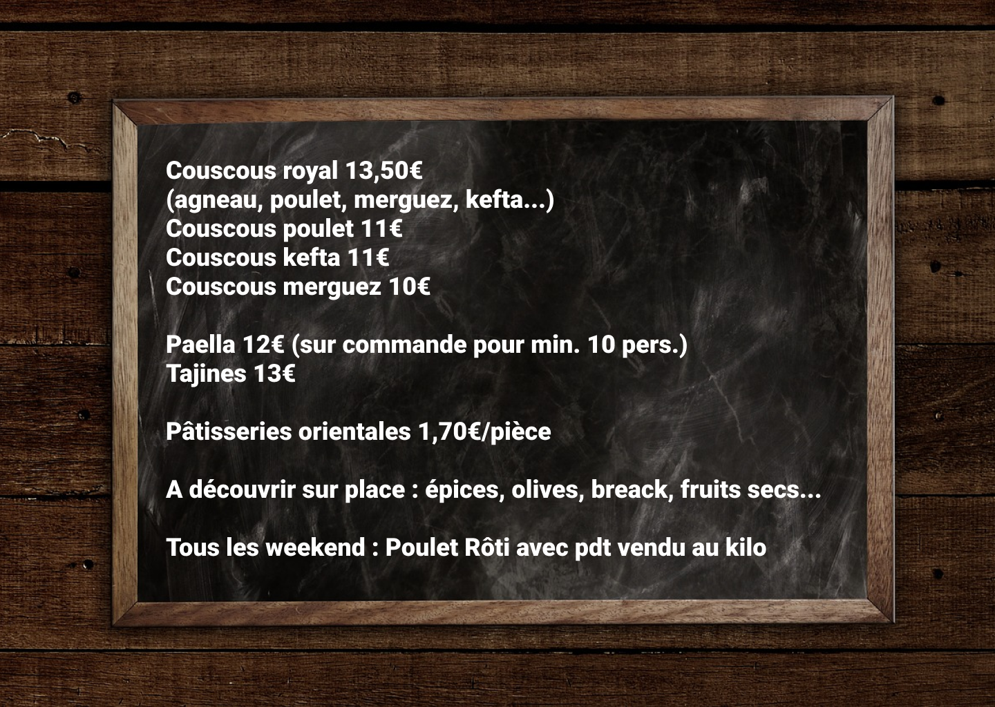 Laissez-vous séduire et profitez de la cuisine orientale riche en traditions. Savourez la cuisine faite maison, créée avec amour par notre chef de cuisine. Savourez des boissons fraîches ou un jus de fruits fraîchement pressé ainsi que des keftas particulièrement délicieuses ou poisson. L’après-midi, nombre d’entre nous aiment déguster le baklava sucré et les pâtisseries variées. Nous serions ravis de vous accueillir pour un déjeuner ou un dîner dans une atmosphère agréable ! Utilisez notre wifi sans frais pour partager vos photos. Profitez de notre parking gratuit. Notre service traiteur est facilement accessible aux personnes à mobilité réduite. Chez nous, vous pouvez régler en espèces ou par des virements bancaires et des chèques. Si vous êtes intéressé, vous pouvez également célébrer votre événement privé dans nos locaux. Les grands événements comme les mariages sont notre spécialité ! N’hésitez pas à nous contacter pour nous faire part de vos idées et vos projets. Nous sommes ouverts tous les jours de 10.00 à 20.00.